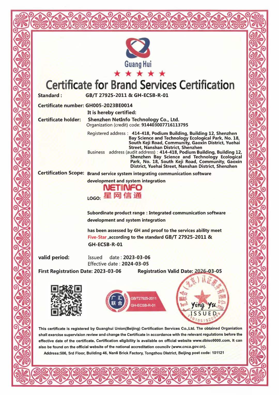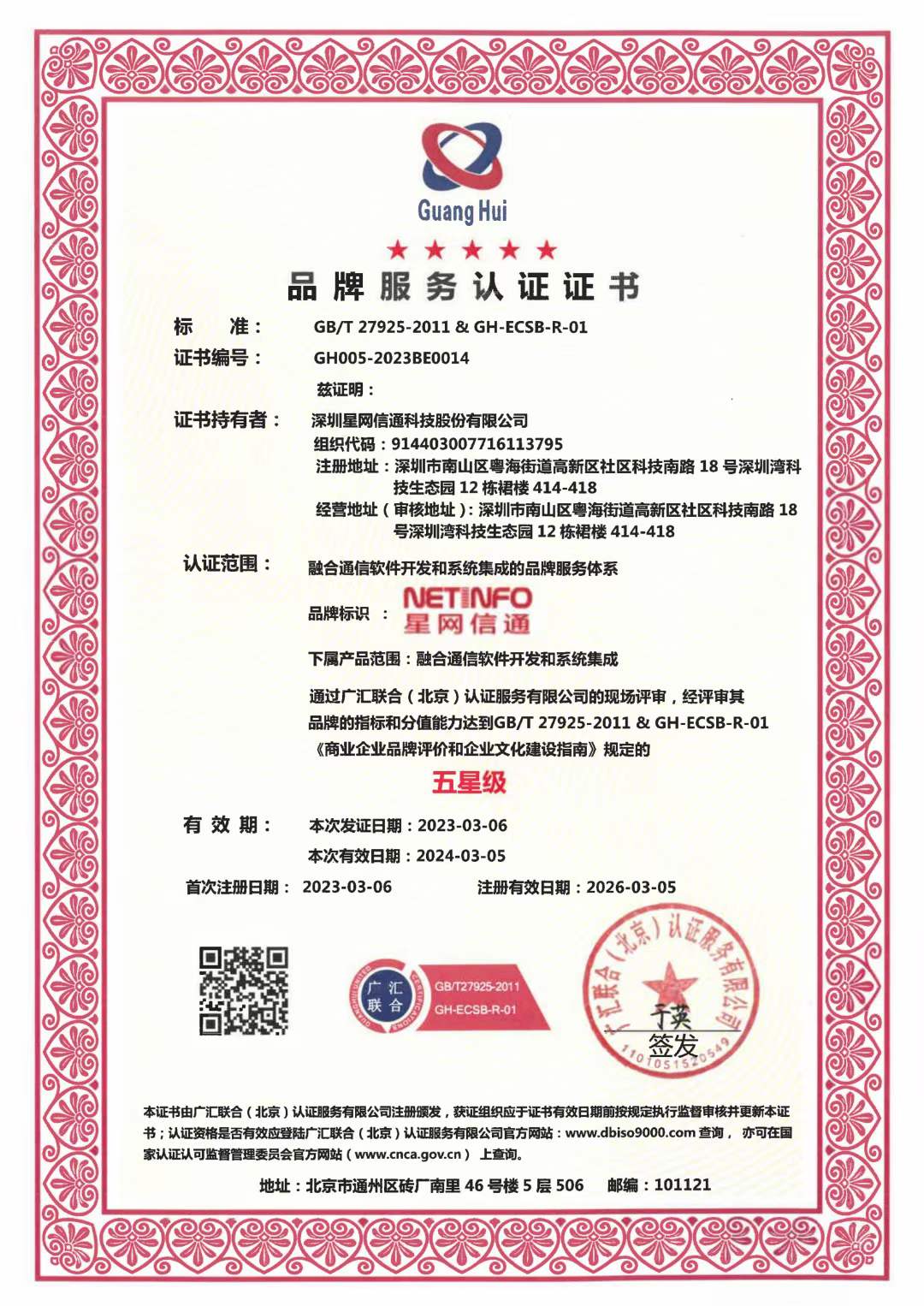 我們非常自豪地宣布,近日,星網信通獲得了“五星級品牌服務認證”,這是我們不斷努力
