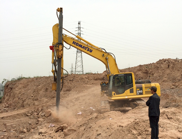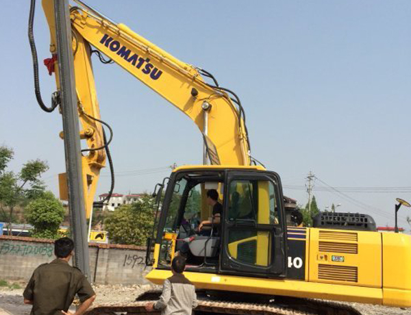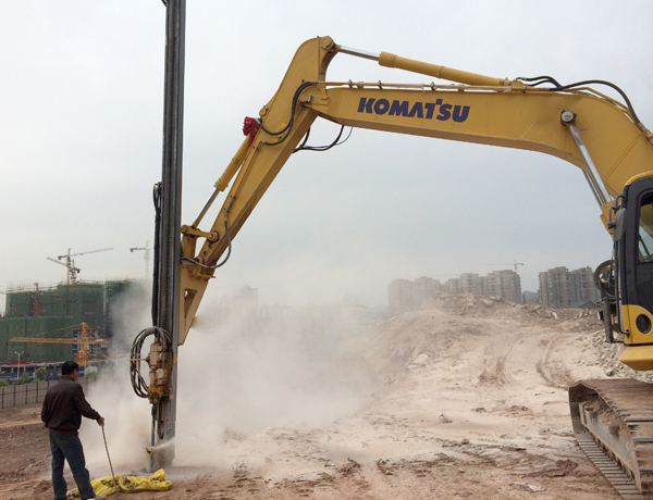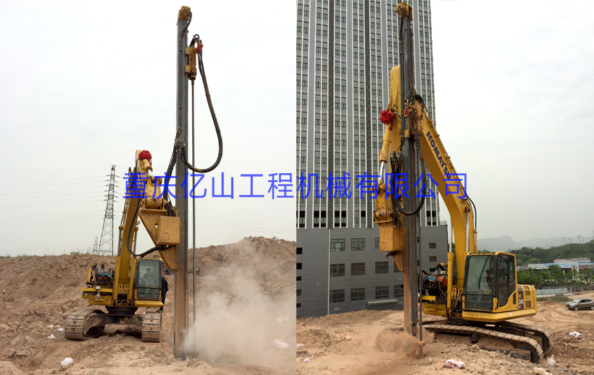 2、前后左右自由伸展,當挖掘機在工地不平坦的情況下, 挖機手可根據位置不同調整鉆桿角度,保持90°垂直鉆孔。