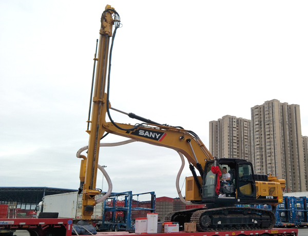 2、前后左右自由伸展,當(dāng)挖掘機(jī)在工地不平坦的情況下, 挖機(jī)手可根據(jù)位置不同調(diào)整鉆桿角度,保持90°垂直鉆孔。