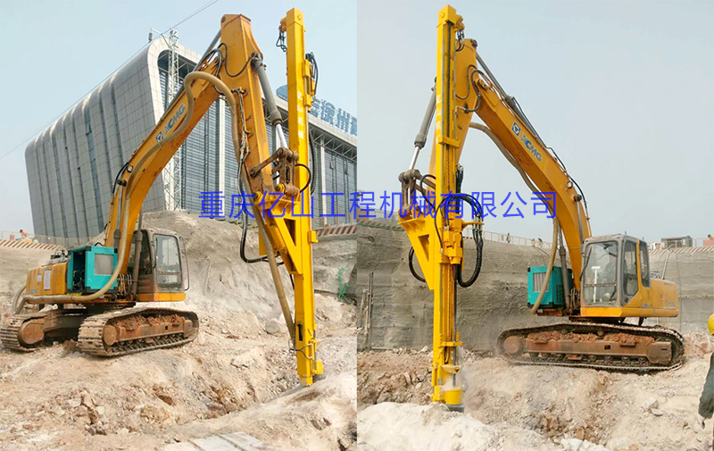 鑿巖鉆機是新式的挖改鉆機設備,效率很高,由液壓總成,鉆臂總成,空壓機總成(挖機一體),動力機頭,釬桿釬頭(耗材)幾大部件構成,在工作原理上看起來類似切削鉆機,但是在動力機頭在液壓要求和液壓動力上有本質區別,所需的鉆頭和釬頭也是不同的工作原理。鉆孔孔徑42-90mm(孔徑大小決定機頭的選擇),適用于高硬度石層,對一般的花崗石,石英石都能達到很好的效果,在一般的硬石上,打孔效率可達2-4米/分鐘,鉆臂軌道長度為3米或6米,打孔深度為6米。液壓總成提供液壓馬達的扭矩,空壓總成完成排渣工作。對液壓動力的要求較高,推薦改裝挖機低噸位10噸。